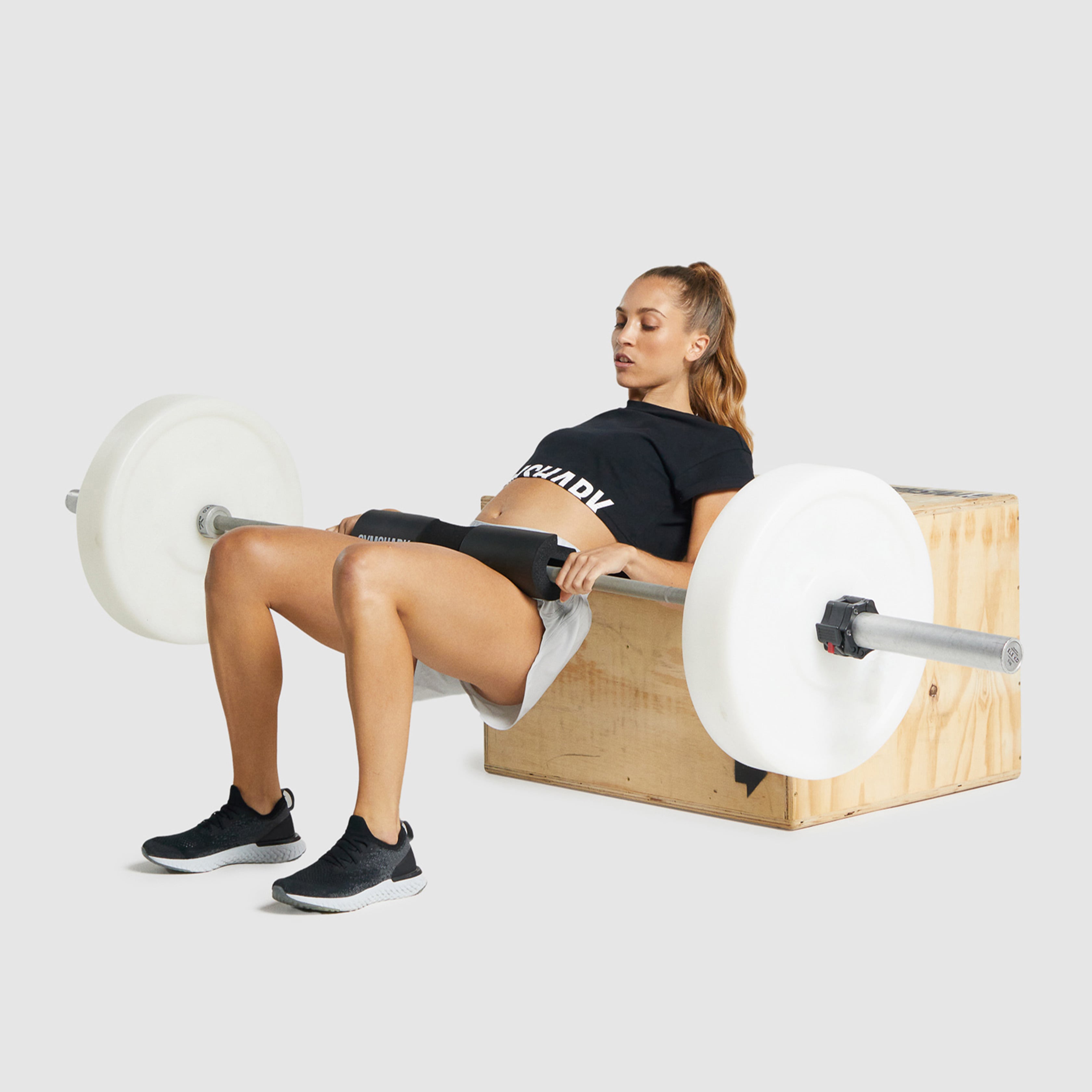 First, you’ll need to find a bench or a box that you can rest the bottom of your shoulder blades against. Then, set your barbell up and attach the barbell pad around the barbell, exactly in the center. If your barbell pad has velcro, make sure it’s done up, and always have the opening-side facing outwards (not resting on your body) to prevent slipping.